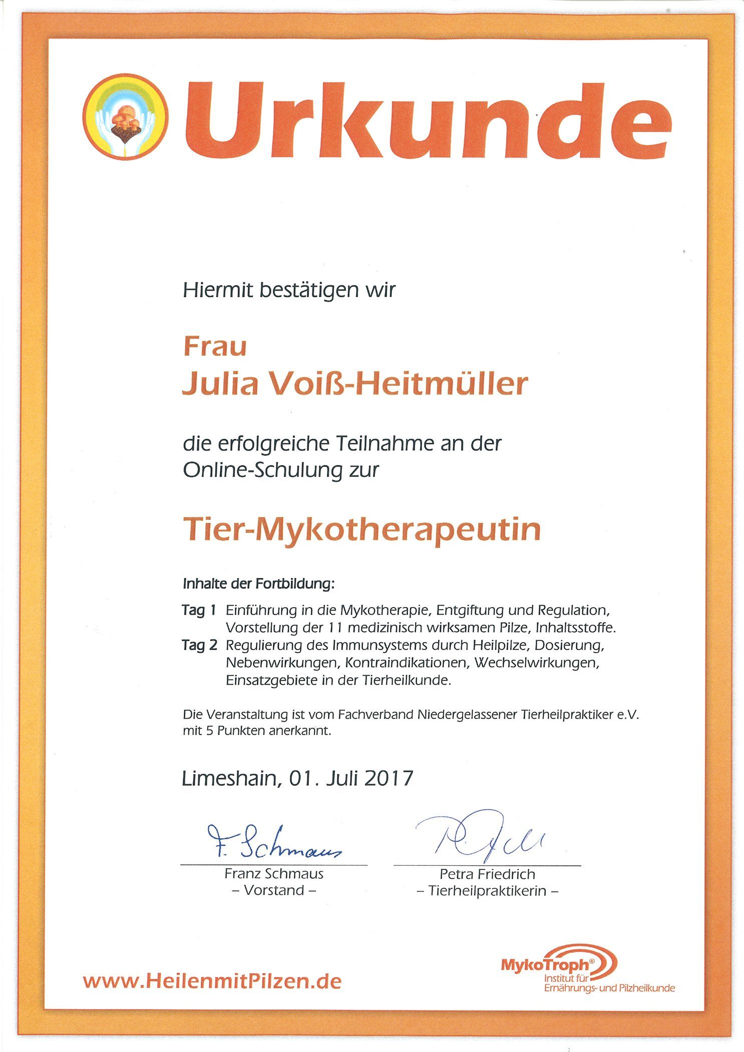 - Juli 2017 – Tier-Mykotherapie